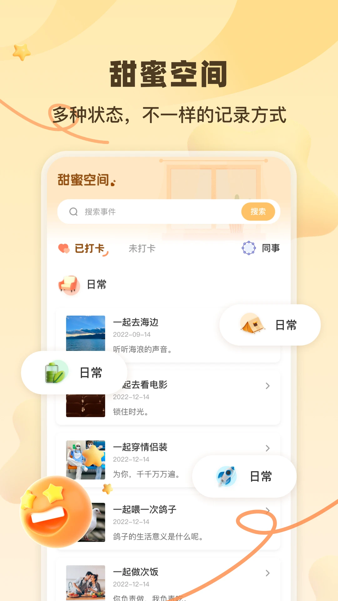 一百件事:精心设计的打卡系统,让你和TA逐步完成爱的100件小事,每完成一项都能添加到专属的甜蜜空间永久保存。甜蜜空间:这个私密空间可以记录每件事的完成状态,支持添加备注和照片,让回忆更加生动立体。日历:内置智能日历功能,可以设置重要纪念日提醒,还附带日记功能,让你随时记录当下的心情与感悟。