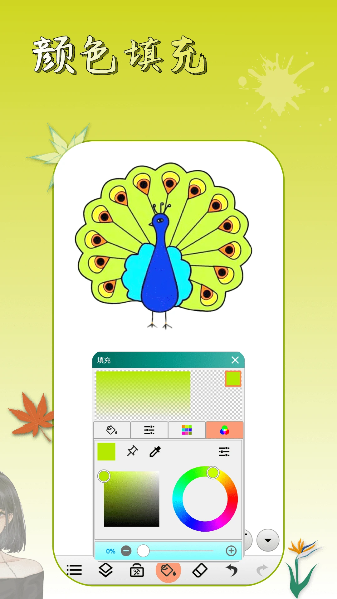 调色板功能是这款应用的亮点之一,内置210种标准颜色,并支持用户自定义添加或删除颜色。高级的颜色调整工具包括RGB调节、吸管取色和透明度设置,让您能够精准调配出理想的色彩。填充功能同样强大,支持单色填充、渐变填充以及多种图案填充(如条纹、圆点、砖块、网格等),为作品增添丰富的视觉效果。