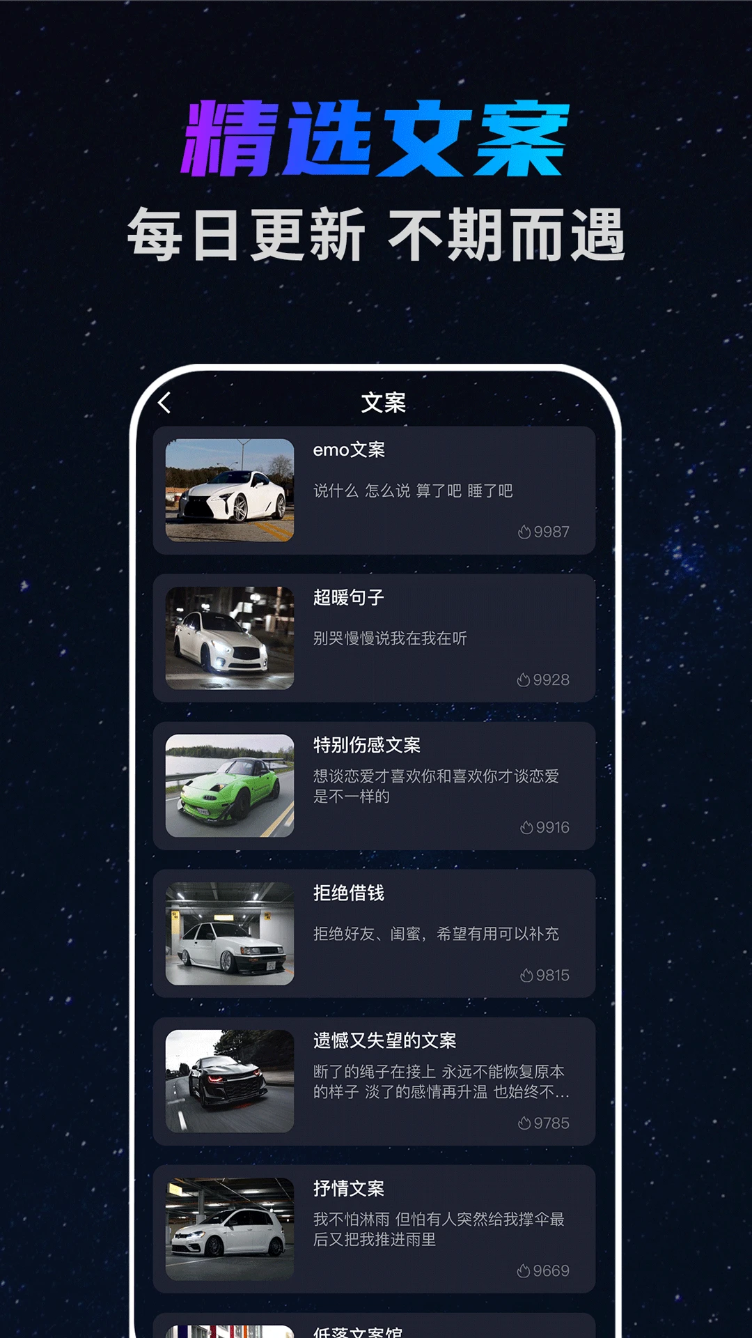 欢迎使用我们的予音APP,这是一个为您提供各种类型视频、文案、图片的朋友圈素材。集各类豪车、酒吧背景,劲爆音乐、生活文案等朋友圈可发素材,您可以根据自己的需求选择不同的类别进行浏览和配音,融入自己的声音。使用我们的APP非常简单,您只需要打开APP,选择感兴趣的类别,浏览并选择您喜欢的视频即可编辑配音,我们还提供了分享功能,让您可以直接将你制作的视频分享到社交媒体上,让更多人看到您的创意。当下实时的,热门的各类素材每日更新,感谢您的使用!