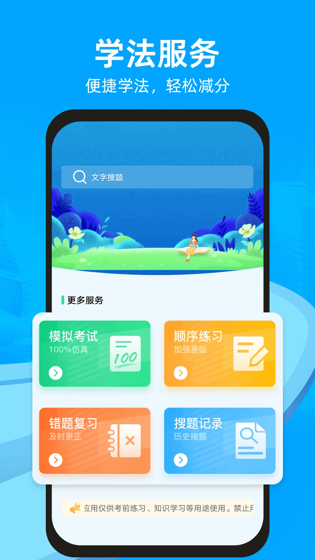 学法减分精灵APP有拍照搜题,文字搜题,模拟考试、专项练习、错题练习等功能,实时同步更新学法减分考试题库,拥有完善的学法减分题库大全。通过大数据深度分析,用科学有效的方法帮助考生快速通过学法减分考试,是帮助车主通过学法减分神器,是您学法减分助手。【学法减分搜题】又拍照搜题和文字搜题两个方式,帮助考生在学习中快速掌握试题,有效的提高学习考试效率,助力考生考试通关。【学法减分练习模块】1、顺序练习:根据新的学法减分考试大纲,涵盖小车、客车、货车、摩托车,各地区题库实时更新。2、模拟考试:按照学法减分考试大纲要求,仿真模拟考试,提前模拟考试环境,帮助考生攻克考试重难点环节。3、错题复习:汇总考生练习错题集,帮助考生提升学习效率,攻克错题难题。4、专项练习:根据学法减分考试大纲要求,对不同的分类知识进行专项学习,帮助考生有效的进行系统化、模块化学习。车主学法减分搜题练习刷题,学法减分拍照文字搜题神器,学法减分题库,秒出答案,驾驶证理论学习难题、偏题搜索练习解答助手,交通新规题库,司机学法减分学习好帮手,交规知识解读,交通新闻资讯分享交流。