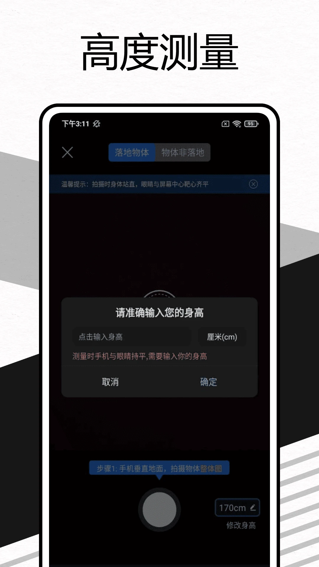 拍照测高功能:通过手机摄像头智能识别物体,结合AR技术快速计算目标高度,精度可达厘米级。