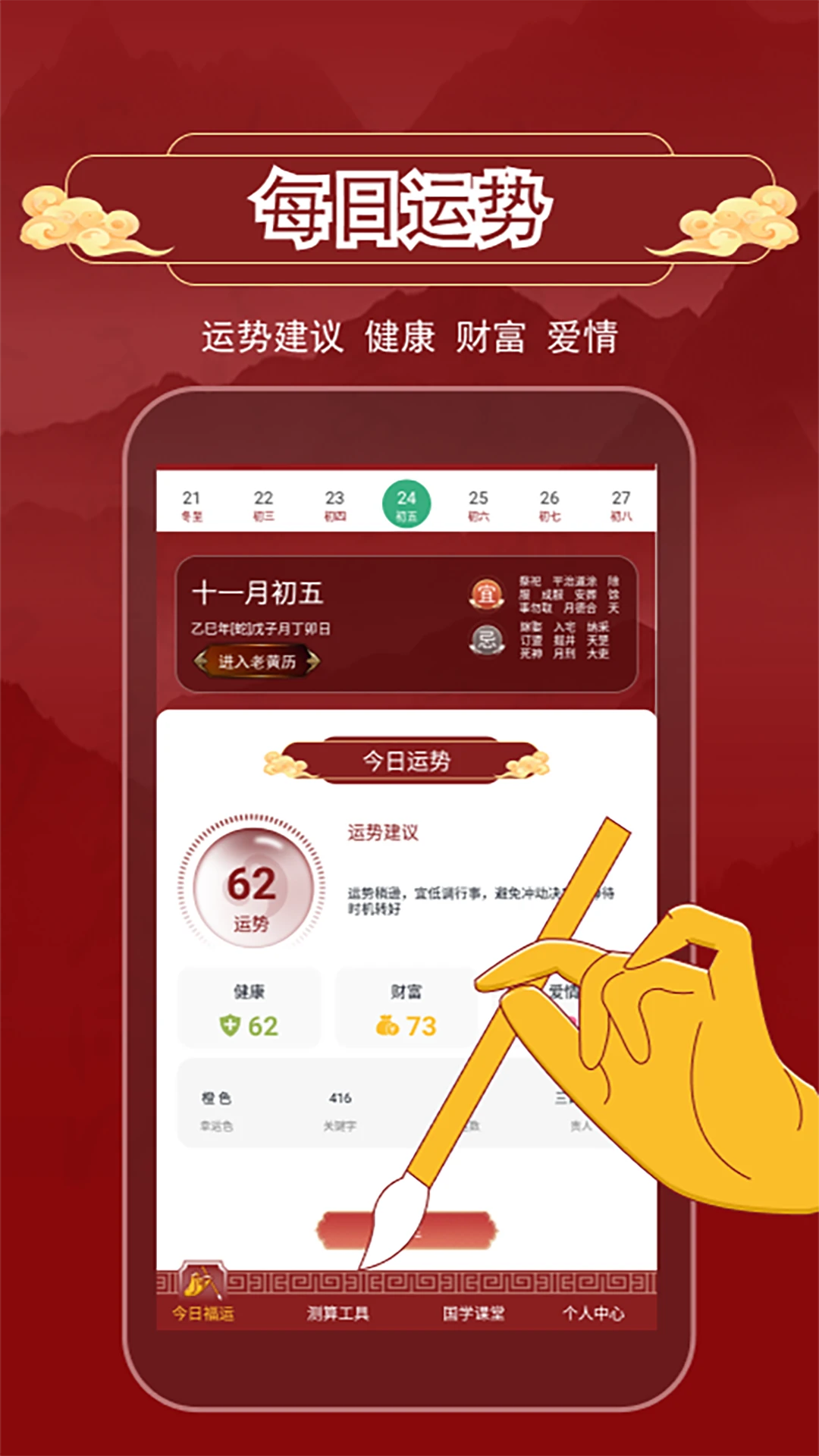 运势测算:实时排盘分析,为用户提供当日运势参考。