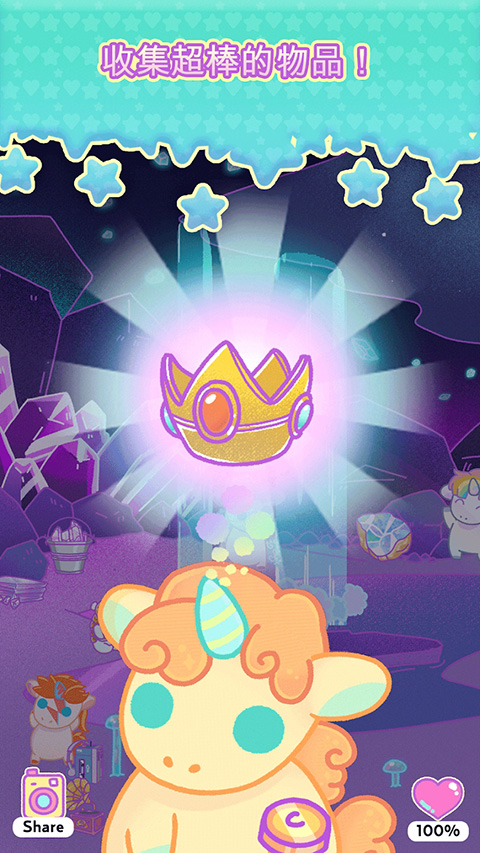 对独角兽进行【宠爱】操作时,可以让它们佩戴上华丽的皇冠,当爱心进度提升至【9%】时,独角兽的愉悦度会明显提高。这种正向反馈会直接影响到它们的探索积极性和物品收集效率。