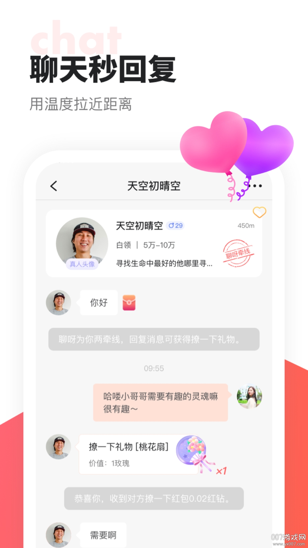 根据您的聊天偏好,推荐附近的人,几秒钟后回聊,告别单身人士;独特的"即时响应"系统确保你的消息总能得到及时回复,让对话始终保持流畅自然。