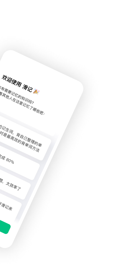 滑记是一款基于前沿认知科学理论的智能学习助手,它运用间隔重复算法和AI智能分析技术,为用户量身定制最优记忆路径。通过科学规划复习时间点,它能有效延长记忆保持时间,显著提升学习效率。无论是语言学习、考试备考还是专业知识的长期记忆,滑记都能提供专业级的记忆支持,让用户以最少的投入获得最大的学习收益。