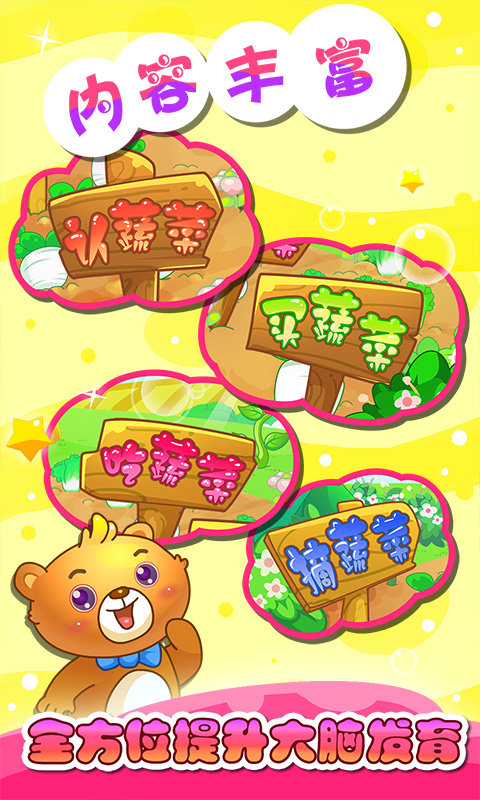 学习更多的蔬菜知识,从不同的游戏场景中学习到各种不同的蔬菜知识。软件内容由专业幼教团队设计,知识体系科学完整,涵盖常见蔬菜的形态特征、营养价值、食用方法等。通过多场景反复强化记忆,帮助孩子建立系统的蔬菜认知。