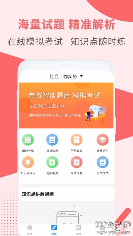 进入首页后,您可以浏览平台提供的所有服务功能,包括题库、课程和考试大纲等。在推荐区域,您可以查看付费精品课程,点击课程详情了解内容介绍和讲师信息。选择适合的课程后,通过购买功能完成支付,即可立即学习并缓存课程视频。此外,题库中心提供多种练习模式,如每日一练、考点专项训练等,您可以根据需求自由切换,随时开始刷题巩固知识点。