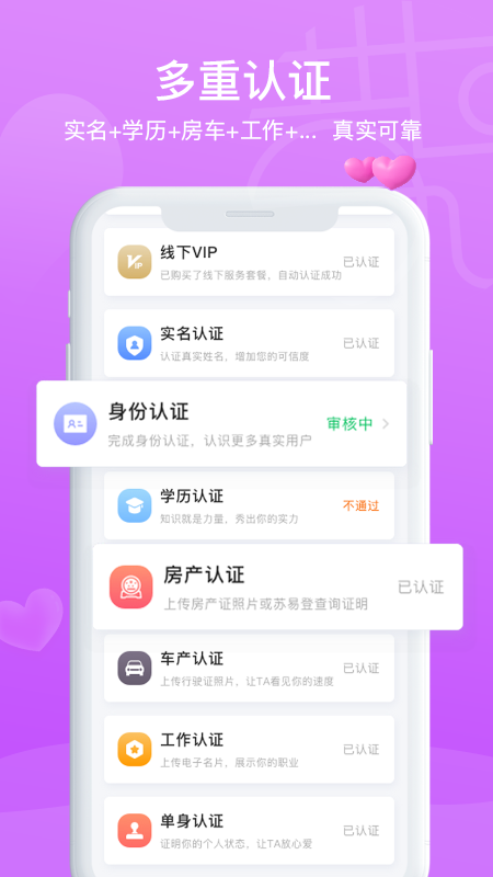 所有用户均通过实名和学历等多重认证,线上认证的同时后台人工严格审核,确保资料的真实性。平台还引入了人脸识别技术,杜绝虚假账号,为用户营造安全可靠的交友环境。每个注册用户都需要上传至少三张真实生活照,保证个人资料的真实性。