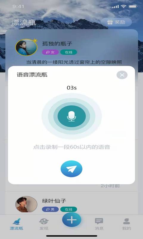 【漂流瓶子】采用经典漂流瓶玩法升级版,支持语音、文字、图片多种形式投递,每个瓶子都承载着独特的故事。在浩瀚的虚拟海洋中,你既能抛掷心事等待回应,也能拾取他人心声给予温暖,这种双向互动让孤独的灵魂找到共鸣。