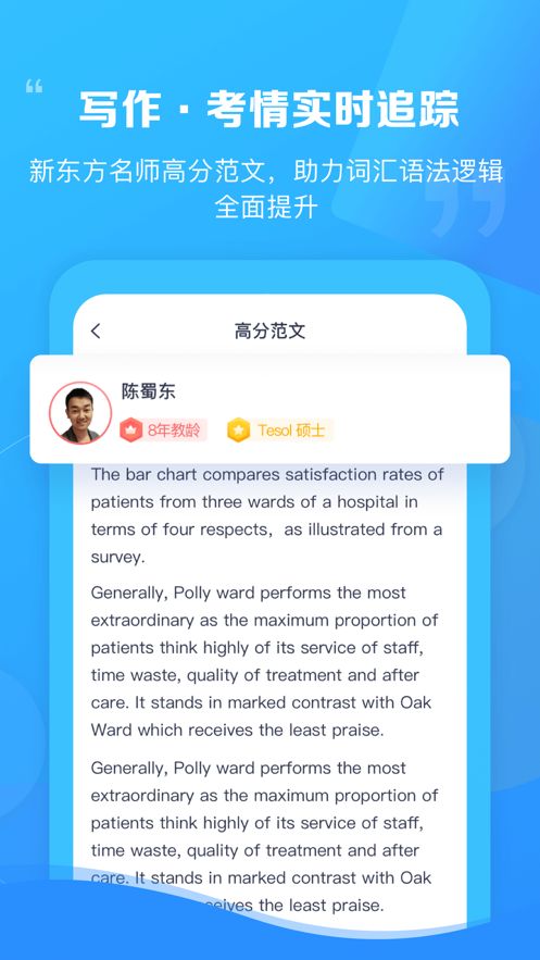 内置大量优质学习资源,包括外教标准发音示范音频,帮助学生掌握地道表达方式。同时提供名师高分范文库,这些范文不仅展示了优秀的写作技巧,还包含了详细的评析,让学生能够快速提升写作水平。应用还支持智能批改功能,能够即时反馈练习结果,指出需要改进的地方。