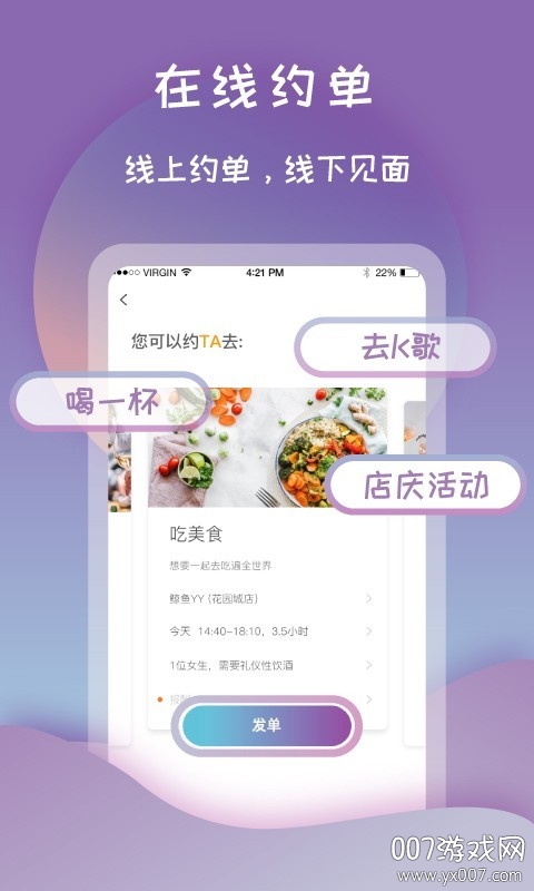 【欢乐约单】同城约,线下见,与心仪的对象面对面聊天,共享快乐交友。系统会智能推荐合适的约会对象,并提供安全可靠的见面环境,让约会更放心。