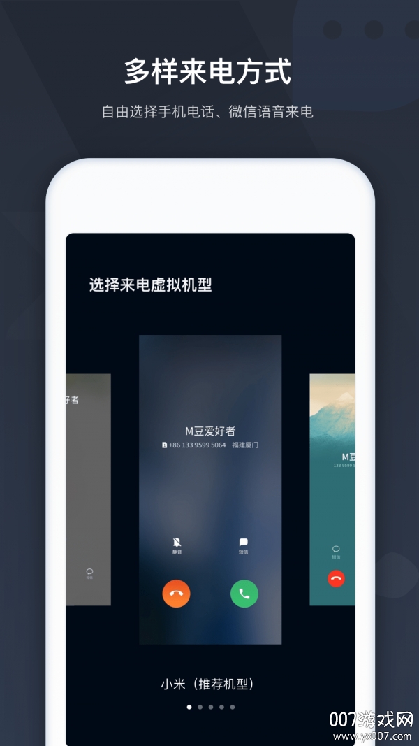 逼真界面:跟通话界面相似度:100%。高仿逼真多款手机品牌机型的系统来电通话界面,左右滑动选择切换来电通话界面。逼真的通话界面,让人难以分辨。界面细节包括运营商标志、信号强度等一应俱全。