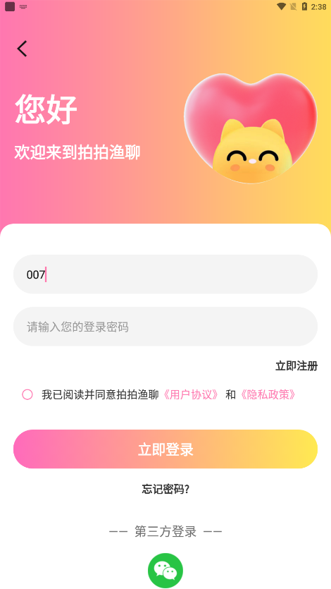 拍拍渔聊(com.yuyin.paipaiyuliao)是一款专注于语音社交的创新型应用,为用户打造了一个充满活力的线上互动空间。在这里,你可以体验到丰富多样的社交模式和趣味十足的聊天功能,无论是想结识新朋友、寻找志同道合的伙伴,还是期待一场浪漫的邂逅,拍拍渔聊都能满足你的需求。平台汇聚了众多高颜值的用户群体,包括活泼可爱的小姐姐和阳光帅气的小哥哥,为你的社交生活增添无限可能。特别推荐给渴望脱单或希望拓展社交圈的朋友们,快来加入这个充满惊喜的社交世界吧!