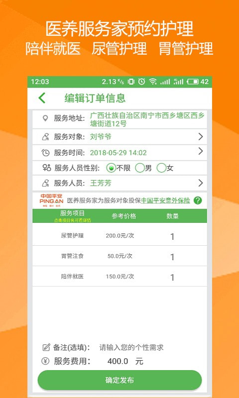 预约护理:采用智能推荐算法,可根据老人健康状况、护理需求精准匹配专业护理人员,支持查看护理师资质证书和服务评价。