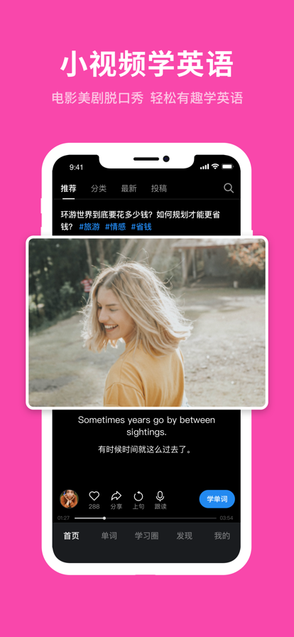 【科学学习方法】基于第二语言习得理论,创新研发了多种高效学习模式:包括字幕循环、倍速循环、回音跟读、跟读评分、盲听训练、精听练习等。特别设计的单词胶囊和视频背单词功能,让记忆单词变得轻松有趣。精选热门影视剧、MV、纪录片等内容,结合生活化场景,打造VIP式沉浸学习体验,堪称懒人学英语的最佳选择。