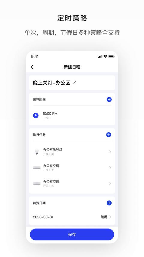 单次、周期、节假日多种策略全支持;支持日出日落自动调节功能。