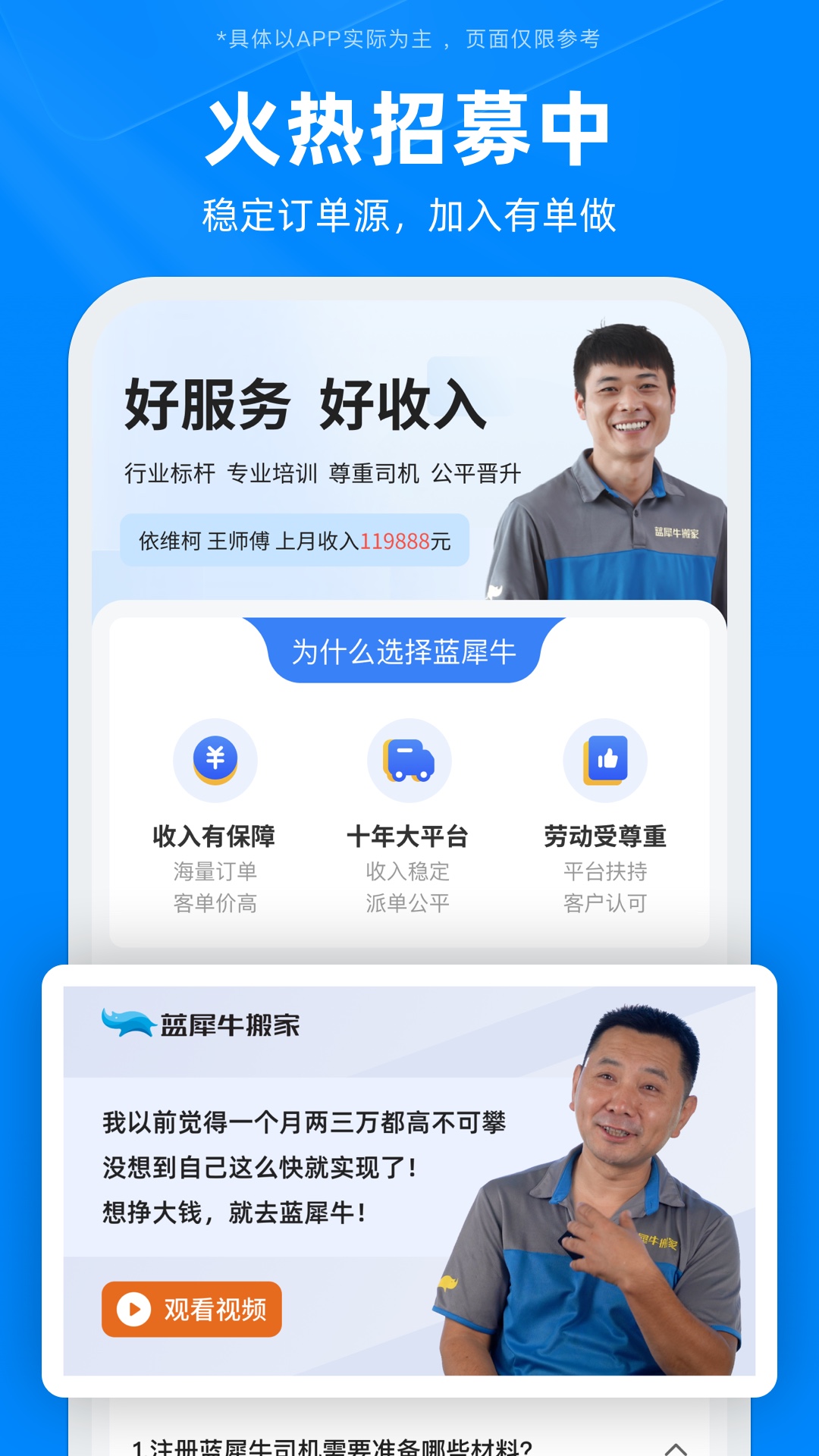 蓝犀牛司机端APP是一款专为搬家司机打造的智能接单平台,致力于为司机提供高效便捷的工作体验。通过实名认证保障交易安全,司机可以随时随地在线接单,系统会根据地理位置智能推送附近订单,大幅提升接单效率。平台采用即时结算机制,运费到账快且支持随时提现,让司机收入更有保障。此外,APP还提供订单管理、收入统计等实用功能,全方位满足搬家司机的日常需求,是提升工作效率、增加收入的理想选择。