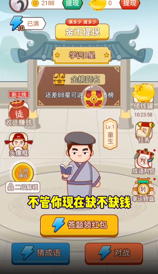 这款创新的成语答题游戏不仅考验你的知识储备,更能为你带来实实在在的收益。游戏采用寓教于乐的方式,通过趣味性的关卡设计,让玩家在猜成语的过程中不断提升语文能力。每天只需花费几分钟时间,就能享受游戏乐趣,同时积累可观的现金奖励。