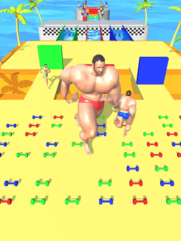 游戏采用精美的3D卡通渲染风格,每个角色都经过精心设计,夸张的肌肉线条搭配搞笑的动画效果,为玩家带来视觉上的享受。创新的玩法机制要求玩家不仅要快速反应,更要善于思考:如何规划最优路线、何时使用道具、怎样干扰对手都需要仔细考量。比赛过程中,玩家需要在赛道上不断收集散落的哑铃,数量越多得分越高,但也要注意不要被对手抢走。游戏还加入了物理碰撞系统,让玩家之间的互动更加真实有趣,你可以通过合理的碰撞来干扰对手的节奏!