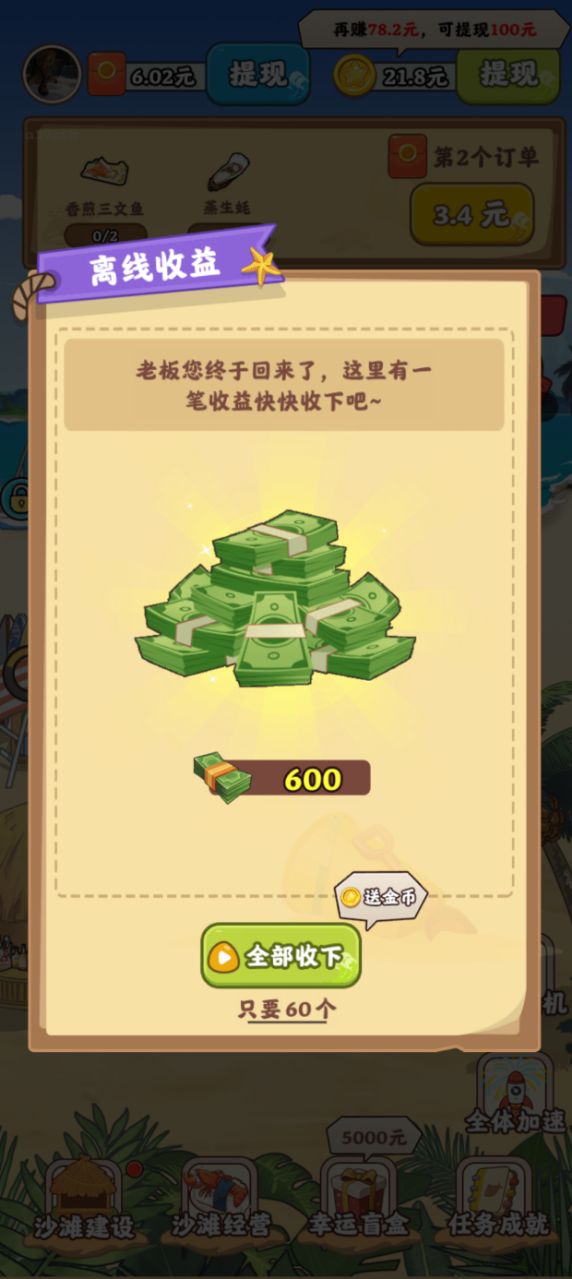 以海边风情为的经营游戏,通过制作各种海鲜美食来完成订单,获得不错的红包奖励,非常轻松休闲的玩法。精致的画面表现和生动的音效设计,完美还原了海滨度假的惬意氛围。