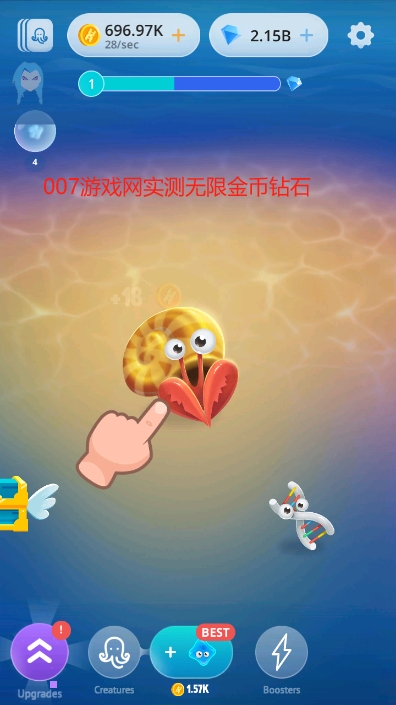 这款游戏最令人兴奋的地方在于其丰富的生物进化系统。通过合并不同物种,你可以创造出全新的品种,就像著名的鱼类登陆进化成陆地生物一样神奇!你可以选择相同的原始生物,通过调整它们的基因特性来观察不同的进化结果。游戏还提供了多种辅助道具,比如购买水晶可以加速进化过程,使用磁铁可以快速融合屏幕上的同类生物。