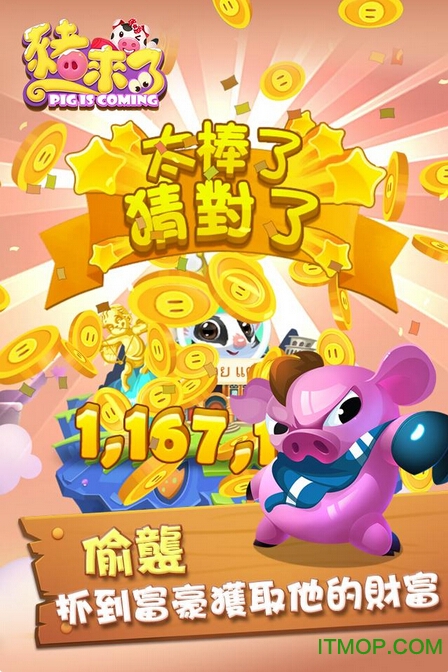 【猪猪王保佑你】游戏内置了趣味十足的转盘系统,玩家可以通过转盘获得各种惊喜道具,包括海盗宝藏、侠盗装备等。但要当心,在偷取他人金币的同时,也要防范其他玩家的复仇行动!