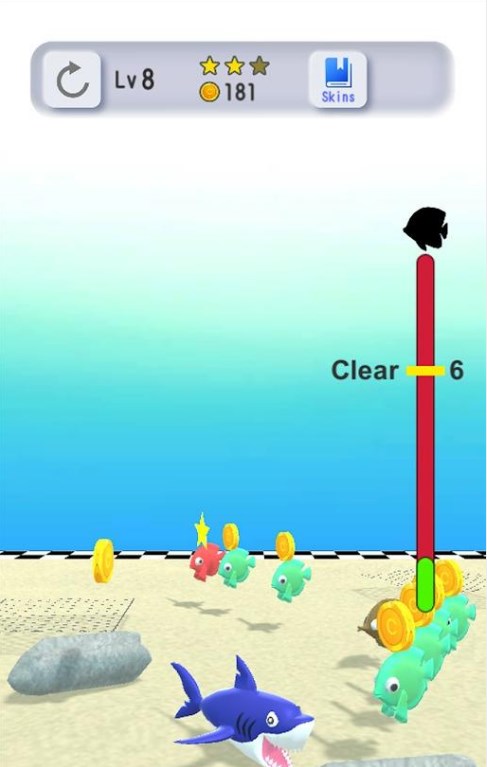 游戏最大的特色在于将物理弹射机制与传统的大鱼吃小鱼玩法完美结合。玩家不仅要考虑如何吃到更多小鱼,还要精心计算弹射角度和反弹路线。场景中的障碍物不仅会阻挡鲨鱼前进,还能成为反弹的助力,这种动态平衡的设计大大增加了游戏的可玩性。部分关卡还设有移动的障碍物和特殊机关,玩家需要观察它们的运动规律,抓住最佳发射时机。随着游戏深入,还会解锁各种特殊能力,如冲刺、磁铁等,为游戏增添更多策略元素。