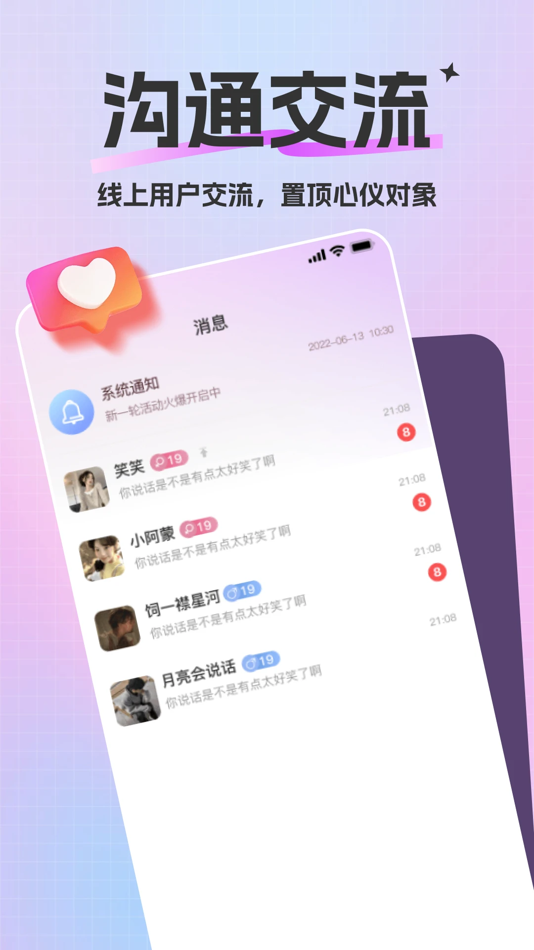 本应用包含同城、交友匹配、在线,相互关注聊天信息相互联络感情。用艺术的笔触,描绘相亲的美好:我们的相遇,就像一幅未完成的画,期待你的色彩。
