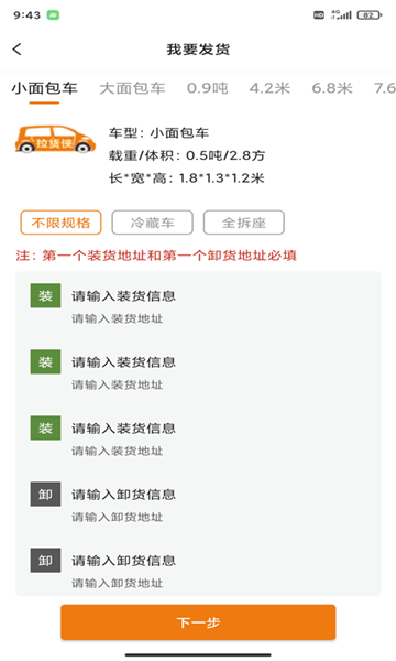 平台提供从微型面包车到大型货车的完整车型选择,包括6.8米、7.6米、9.6米等多种规格货车,满足不同规模的货物运输需求,一站式解决您的货运难题。