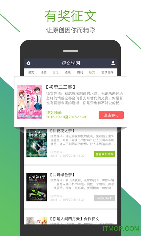 短文学app是一款专为文学爱好者打造的原创作品阅读与创作平台。在这里,您可以尽情欣赏各类精品短篇文学、优美散文和情感美文,同时也能自由发表自己的原创作品。无论是寻找灵感还是分享心情,短文学app都能满足您的需求。平台汇聚了众多优质内容,让您在快节奏的生活中享受片刻的文学宁静。喜欢阅读和写作的朋友们,快来IT猫扑下载体验吧!