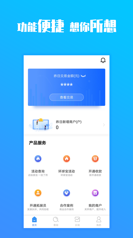 环球客官方版是专为代理商设计的全方位业务拓展平台,其核心功能涵盖收款管理、营销活动、案例展示、资讯推送及商户维护五大板块。通过智能数据看板,代理商可以清晰追踪各项业务指标,实时掌握团队业绩动态。系统还提供定制化数据分析工具,帮助代理商深入挖掘市场潜力,制定更精准的营销策略,成为代理商开拓市场的得力助手。