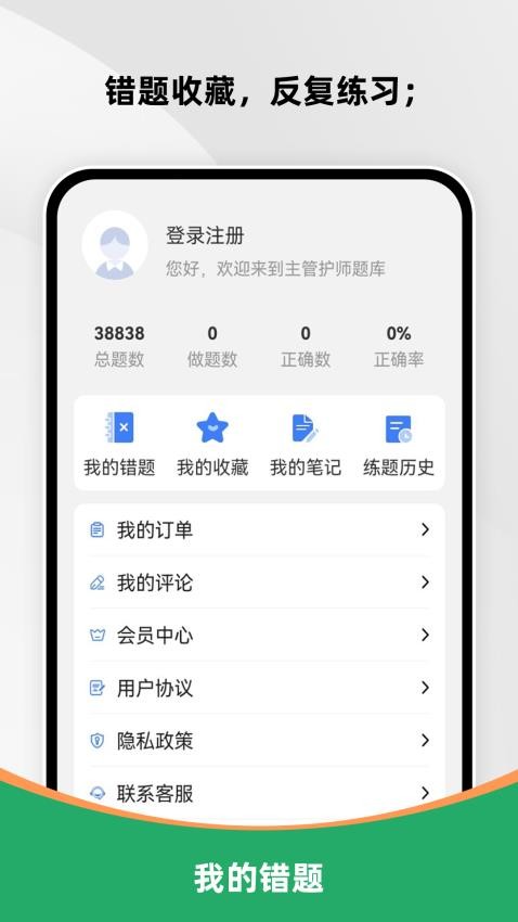 高质量题库包括主管护师职称考试大纲所有章节和考点,按章节划分,选择错题专项练习,附答案。用户可以根据自己的学习进度选择特定章节进行针对性训练,系统会自动记录学习轨迹。