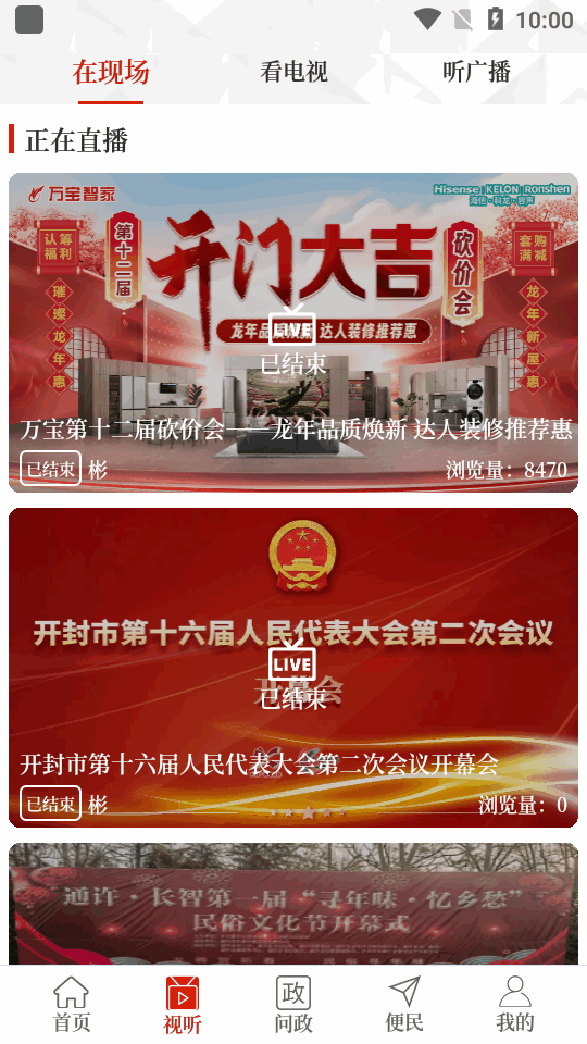 打开软件后,点击底部导航栏的"视听"按钮,即可进入直播界面。在"在现场"板块中,当前正在直播的内容会置顶显示,方便用户快速找到。如果想收看开封本地电视频道,可以切换到"看电视"选项,这里汇集了开封电视台各频道的实时节目。对于喜欢收听广播的用户,"听广播"界面提供了丰富的电台选择,包括新闻、音乐、交通等多个类型。所有直播内容都支持全屏播放,画质清晰流畅。