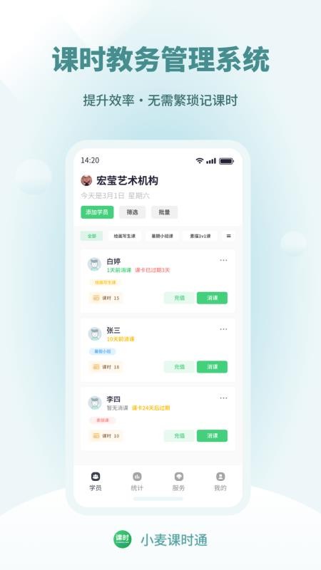 小麦课时通app是一款专为教育培训机构量身打造的智能化课时管理软件,致力于为教育行业提供高效便捷的数字化解决方案。作为一款功能全面的教务管理工具,该软件集学员管理、班级运营、智能排课、家校互动等核心功能于一体,帮助教育机构实现规范化、精细化的运营管理。
