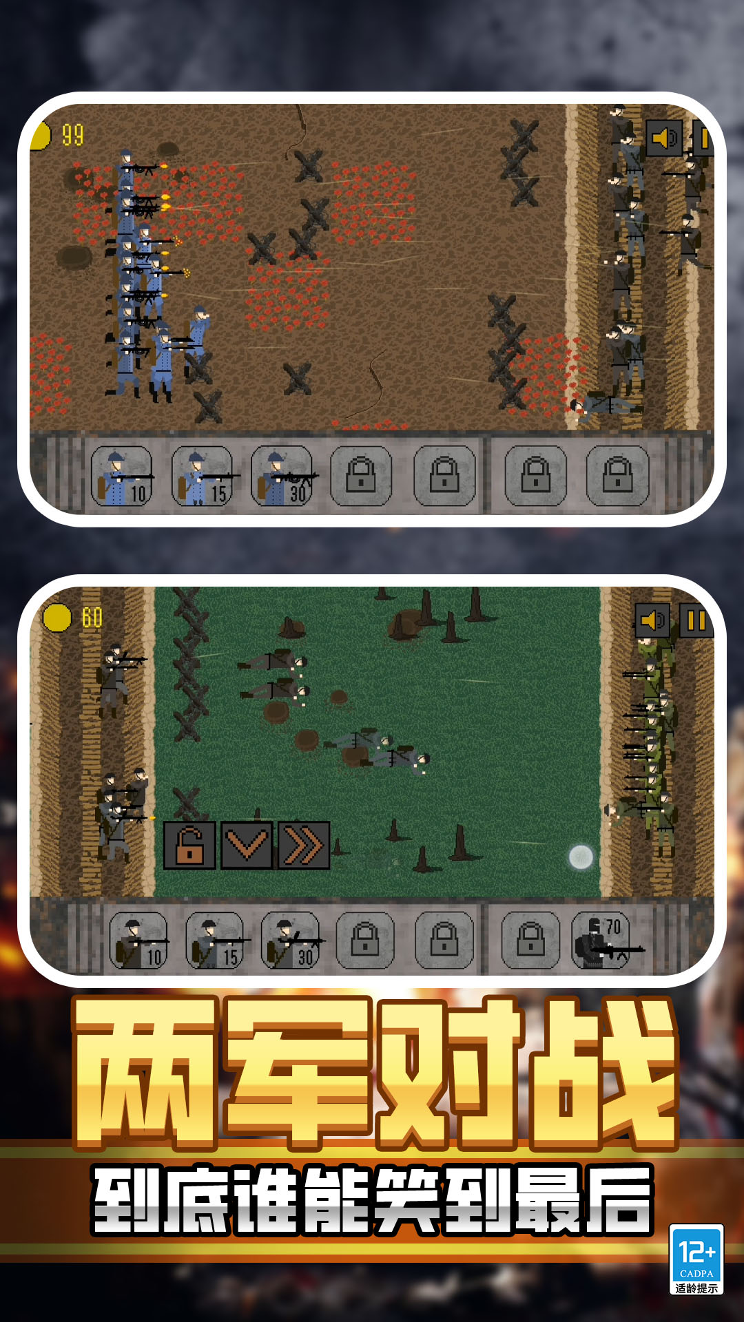 游戏采用经典的像素风格设计,为玩家带来独特的视觉体验。人物和场景的细节都经过精心打磨,完美还原了战争策略游戏的经典元素,让玩家感受到熟悉而亲切的氛围。玩家可以自由选择不同的武器,并根据战场需求搭配最佳的陆军阵容。每一次战斗都可能带来意想不到的变化,你需要灵活应对,利用无限的可能性击败敌人!