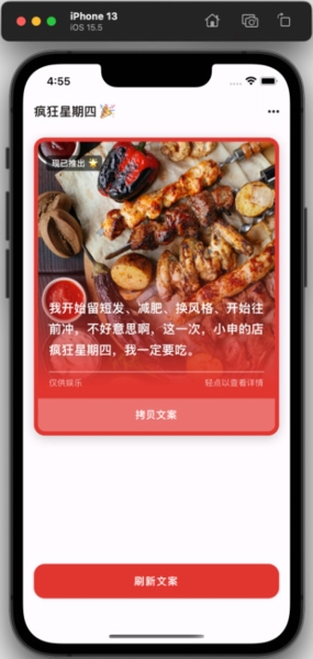 疯狂星期四是一款专为肯德基疯狂星期四活动爱好者打造的趣味文案编辑应用。自从肯德基推出疯狂星期四促销活动以来,每周四都成为了美食爱好者们翘首以盼的日子。为了帮助用户更好地参与这个网络狂欢,我们特别开发了这款可以快速生成和分享疯狂星期四文案的创意工具。无论你是想恶搞好友,还是单纯想参与这个网络文化现象,这款应用都能满足你的需求。