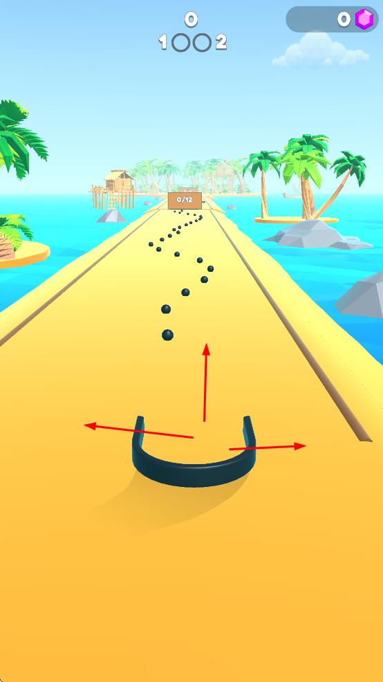 操控黑色U型收集器在热带海岛风格的黄色跑道上移动,通过左右调整位置、向前推进。游戏采用直观的触控操作,玩家只需轻扫屏幕即可精准控制收集器的移动轨迹,随着关卡难度提升,跑道还会出现各种障碍物和转弯设计,考验玩家的操控技巧。