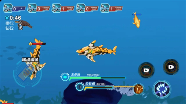 进入游戏后,通过屏幕左侧的虚拟摇杆控制鲨鱼移动方向,右侧的按钮用于发动攻击。长按攻击键可以蓄力发动强力撕咬,对猎物造成更大伤害。