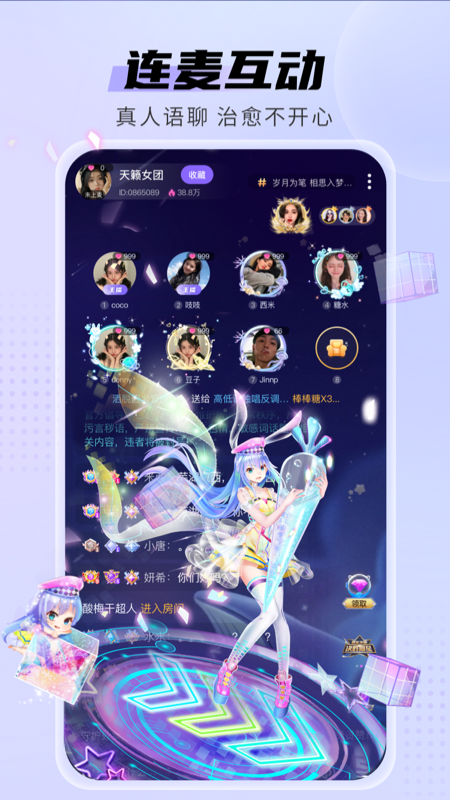 [连麦互动]房间里有很多人拿着小麦。演奏方法丰富多样。小有助于打破僵局,通过语音与助教见面~连麦支持背景音乐播放,营造更浪漫的互动氛围。