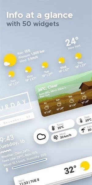 时间,天气和电池小部件:提供从简约到详尽的十余种小部件尺寸和样式选择。