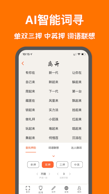 系统内置强大的押韵引擎,只需点击按钮,就能立即获得与当前词语押韵的词组列表。支持多种押韵模式,包括单押、双押、三押等,满足不同音乐风格的需求。同时还能根据音节数自动筛选,确保推荐的词语在节奏上也完全匹配。
