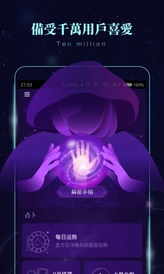 星象密码是一款集星座占卜、运势测算和手相解析于一体的智能APP。通过先进的AI技术,它能精准分析你的掌纹命运线,揭示你与TA的缘分深浅,并提供专业的星座契合度报告。无论你是想了解每日运势,还是探索情感配对,这款软件都能满足你的需求。由国际占星师协会与台湾知名占星师联合开发,其专业性和权威性备受认可。百万粉丝的星象解密品牌背书,让你在探索星象奥秘时更加安心。如果你对星座玄学充满好奇,不妨下载体验这款功能丰富的应用。