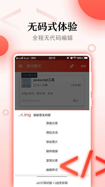 JsHD调试器(简称:JH),是一款革命性的可视化网页js调试工具。它不仅具备传统调试器的所有功能,还创新性地引入了可视化操作界面,让网页调试变得前所未有的简单。通过直观的图形界面,用户可以轻松修改网页元素并自动生成对应的js代码,大大降低了前端开发的门槛。无论是专业开发者还是网页设计爱好者,都能从中获得极大的便利和乐趣。