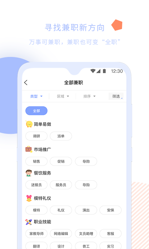 面对不同的兼职方向拥有不同的兼职的岗位为用户提供选择,覆盖了文化创意、教育培训、互联网科技等20多个行业领域;你也可以通过关键字开始的精准搜索需要的兼职工作,支持按薪资范围、工作地点、时间要求等10余个维度进行筛选;提供了更好的兼职保障的服务可以进行兼职工作的反馈处理,每份工作都经过三重审核机制确保真实性;为用户提供了求职的指南的服务帮助轻松的应对各类求职的问题,包含简历制作教程、面试技巧视频等实用资源库。