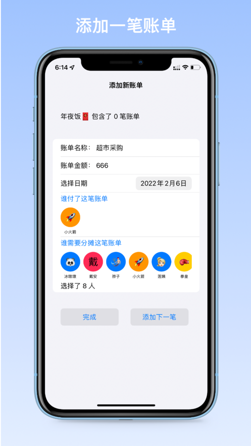平台提供智能分类功能,特别适合聚会、旅行等多人场景的费用管理。用户可以清晰掌握每笔账单的参与人员信息,系统支持自动计算人均费用或自定义分摊比例。在操作界面中,只需填写账单名称、金额和日期即可快速创建新订单,还能随时添加下一笔消费记录。人性化的设计让复杂的分账过程变得简单高效,满足不同场景下的记账需求。