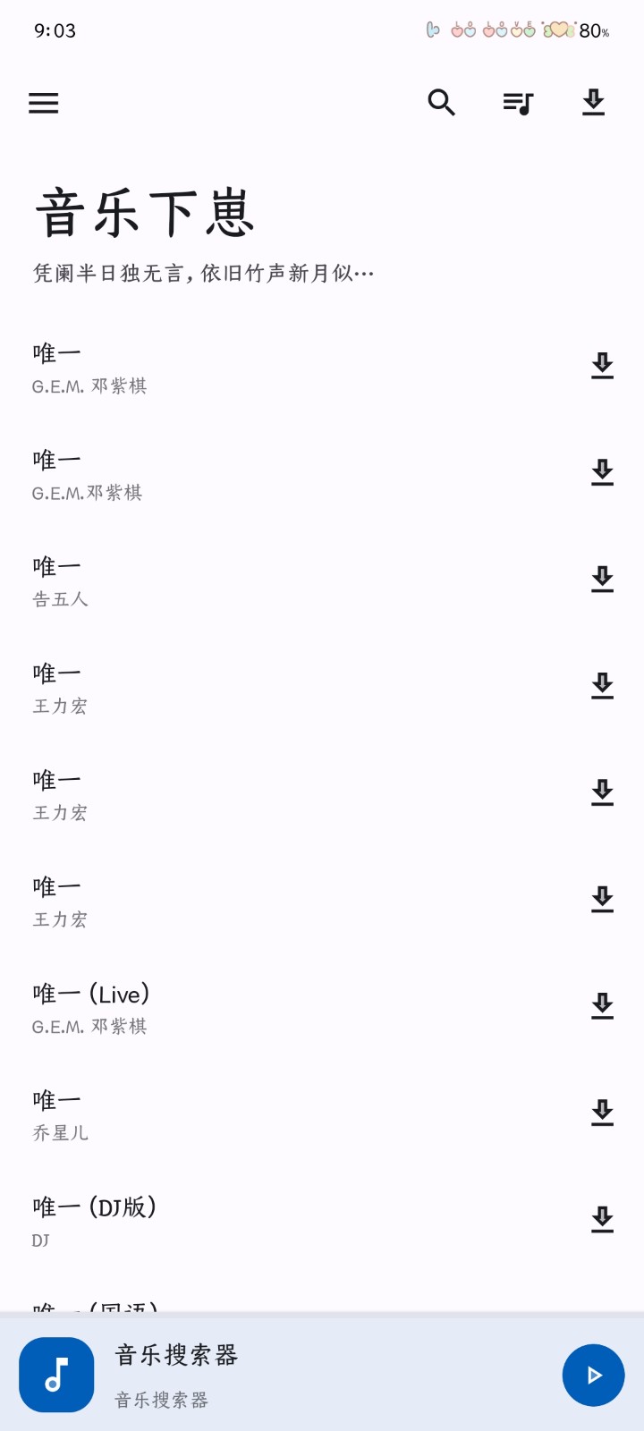 音乐下崽App是一款专为音乐爱好者打造的免费听歌神器,拥有简洁清爽的无广告界面和庞大的曲库资源。无论是最新流行金曲还是经典怀旧老歌,都能在这里轻松找到。App支持多种音质选择,从标准音质到无损音质应有尽有,满足不同用户的听歌需求。独创的智能搜索功能可以快速定位歌曲,一键下载功能让您随时随地享受高品质音乐。更贴心的是,所有音乐资源都免费提供,无需注册即可畅听,是您手机必备的音乐伴侣。