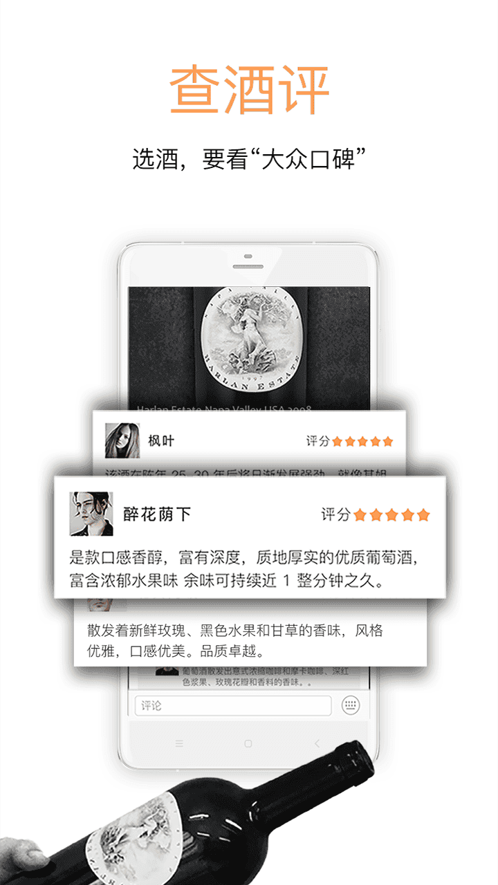 品鉴酒评:聚合百万酒友亲身测评的"大众酒评"和国际认证权威专家评分;用户可查看详细的口感描述和搭配建议;