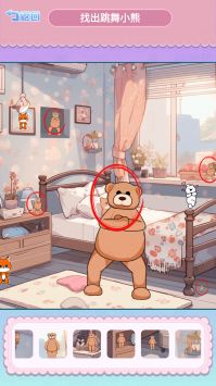 寻找小熊的核心玩法充满挑战性。每个关卡中,跳舞的小熊都巧妙地隐藏在场景的不同角落,需要玩家仔细寻找。为了增加游戏的紧张感,每个关卡都设置了时间限制,玩家必须在规定时间内完成任务才能进入下一关。随着关卡的推进,游戏难度会逐步提升,需要玩家不断提升自己的观察技巧。游戏还贴心地提供了多种实用道具,比如放大镜可以帮助你更清楚地观察细节,提示功能可以指出小熊的大致位置,时间道具则可以延长游戏时间,这些道具都能帮助你更顺利地完成挑战。