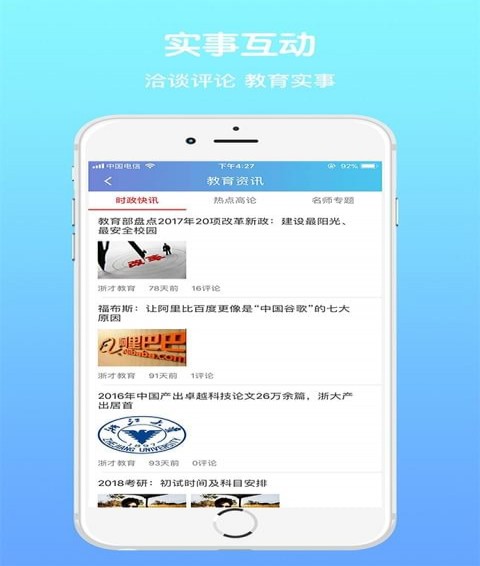 资讯,实时追踪正在发生的教育事件。增加了个性化推荐功能,根据用户兴趣推送相关教育新闻和政策解读。
