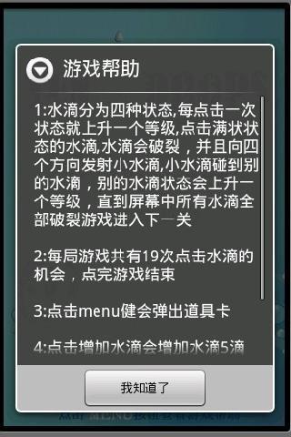 每局游戏共有19次点击水滴的机会,点完游戏结束,这种限制增加了游戏的策略性和挑战性。点击menu键会弹出道具卡,道具卡可以帮助玩家在关键时刻扭转局势。点击增加水滴会增加5滴水滴,合理使用这个功能可以创造更多连锁反应的机会。点击刺水炸弹会让屏幕中所有满状态水滴全部破裂,这个强力道具是通关困难关卡的利器。